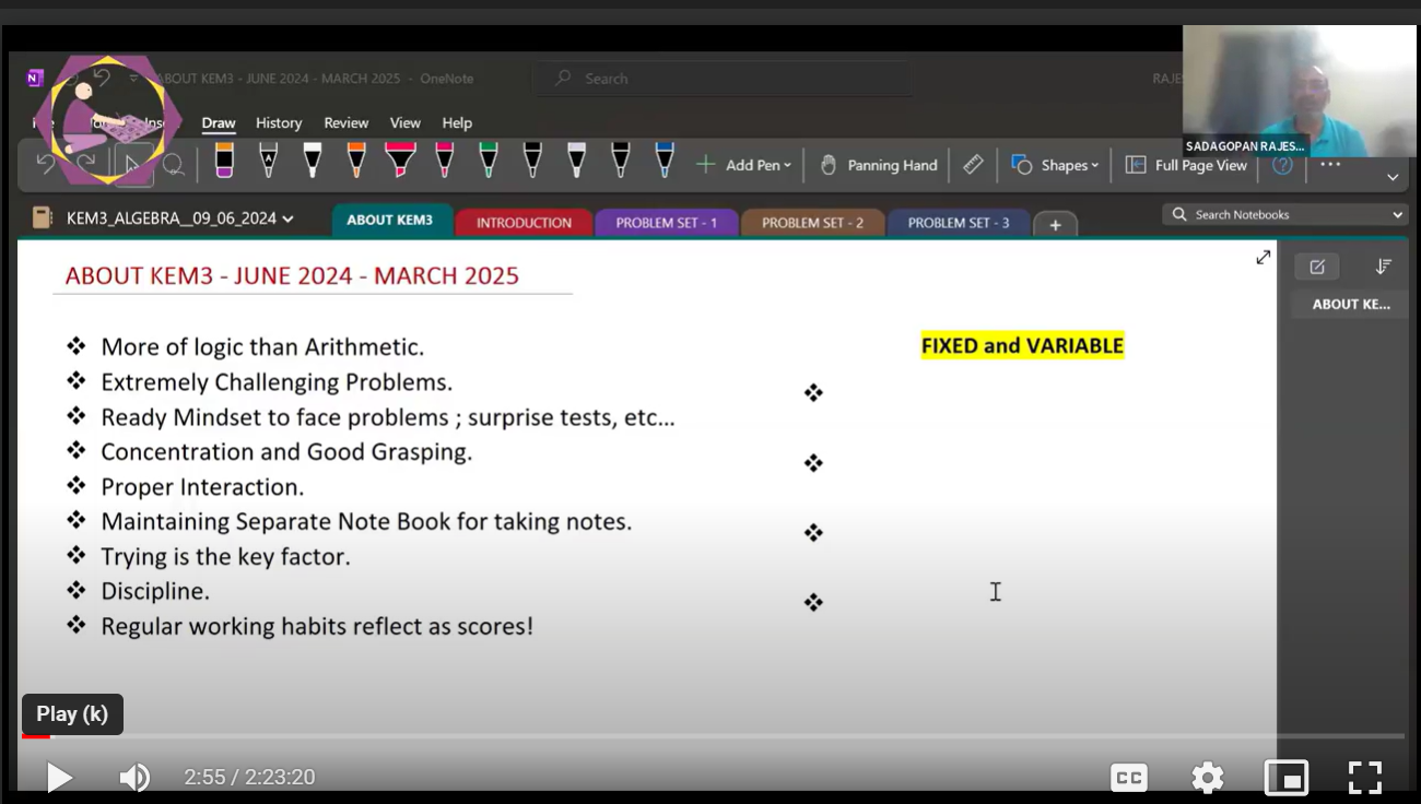 Course focuses on extremely challenging problem solving skills, building upon the foundation laid by KEM1 and KEM2. Great emphasis is placed on presentation skills also.